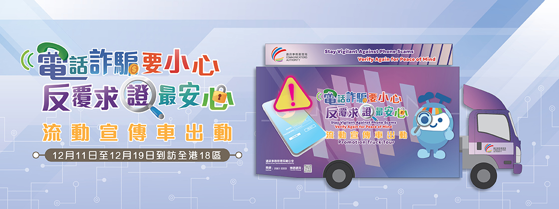 為了讓防電騙信息更深入各社區,通訊事務管理局展開以「電話詐騙要小心 反覆求證最安心」為主題的流動宣傳車活動。活動的目的是提醒巿民對陌生來電及短訊提高警覺,在任何情況下都不應向陌生來電者及短訊發送人透露個人和帳戶資料,以及轉帳金錢,以防受騙。活動詳情如下: